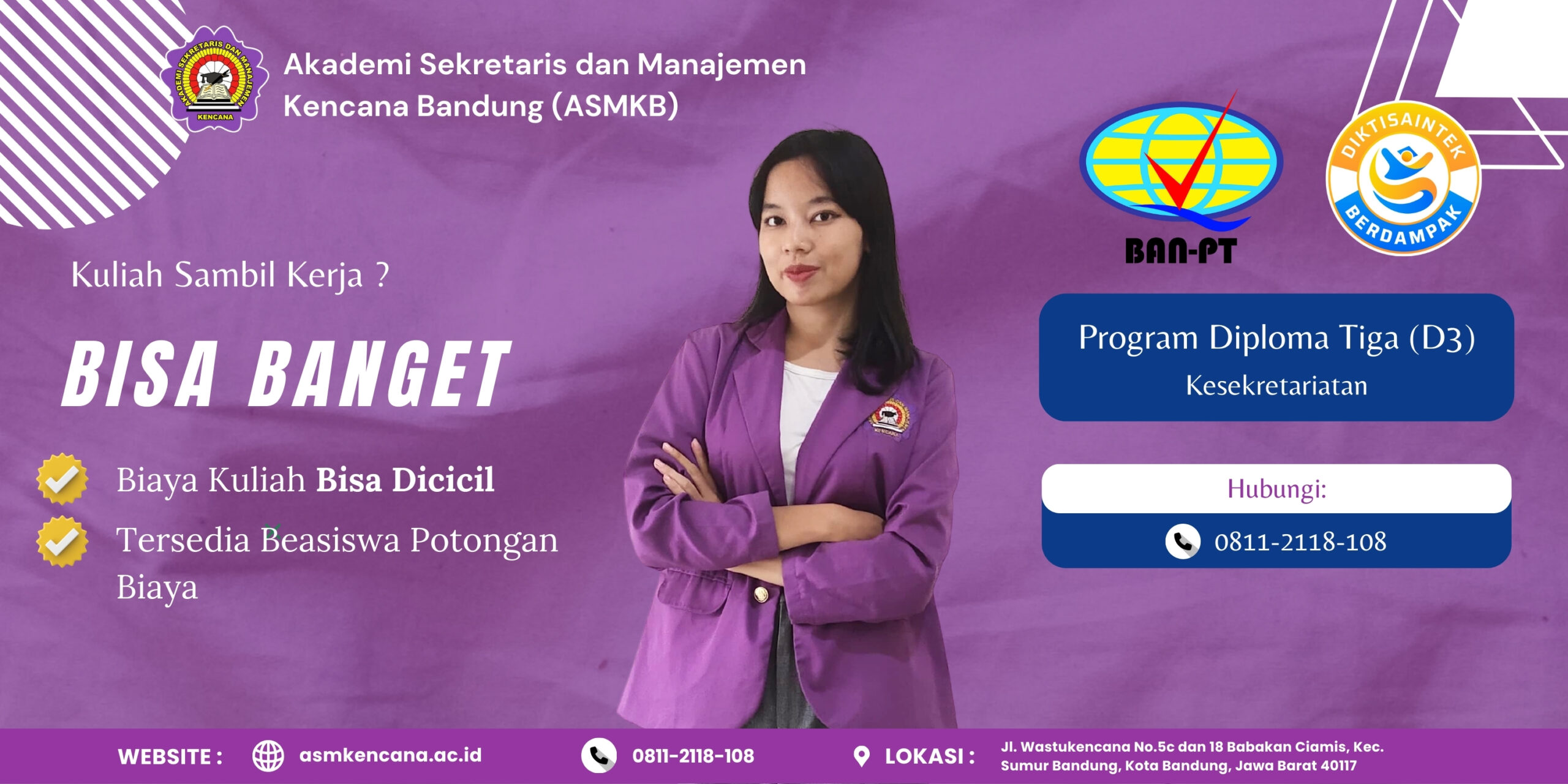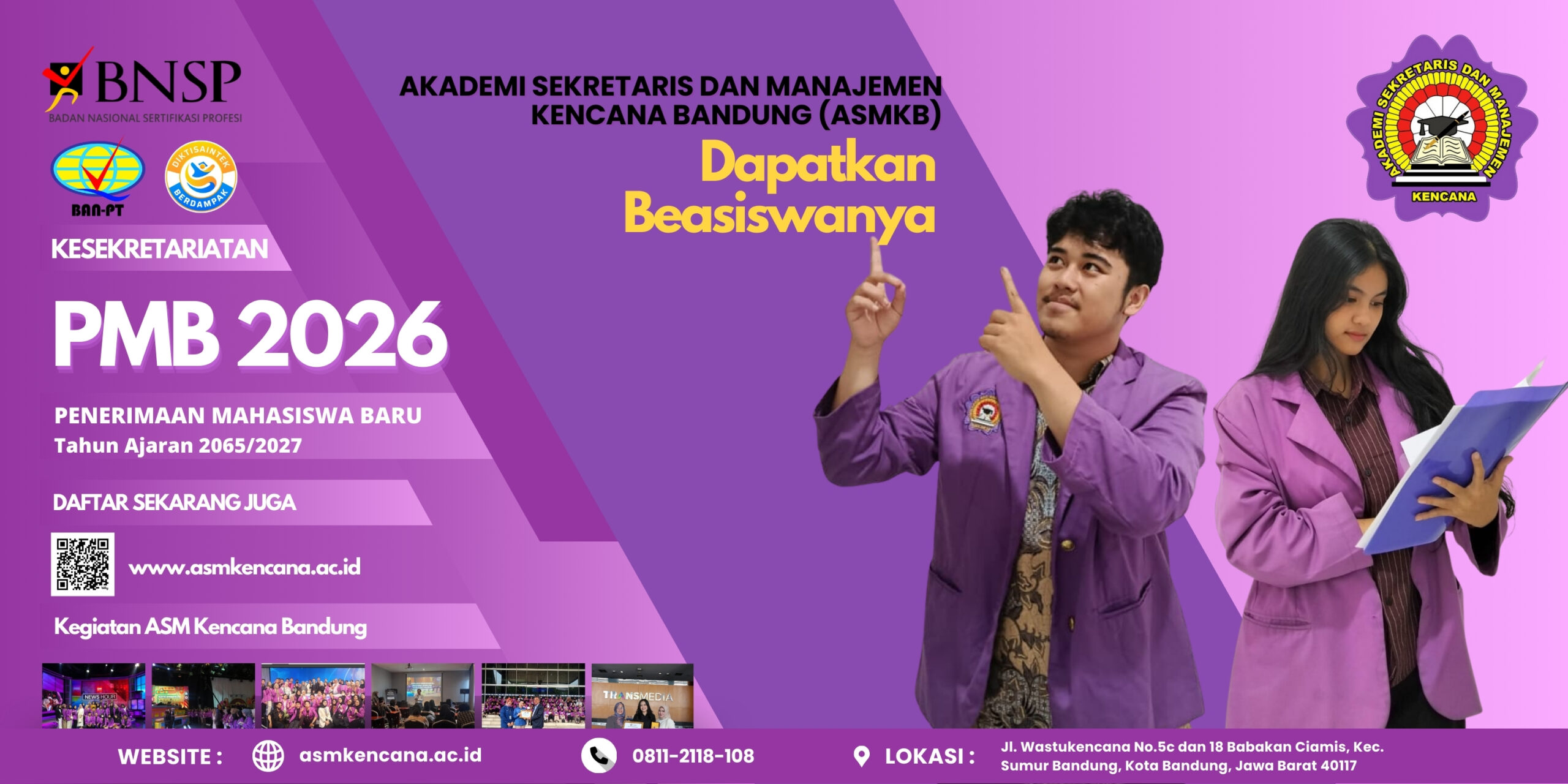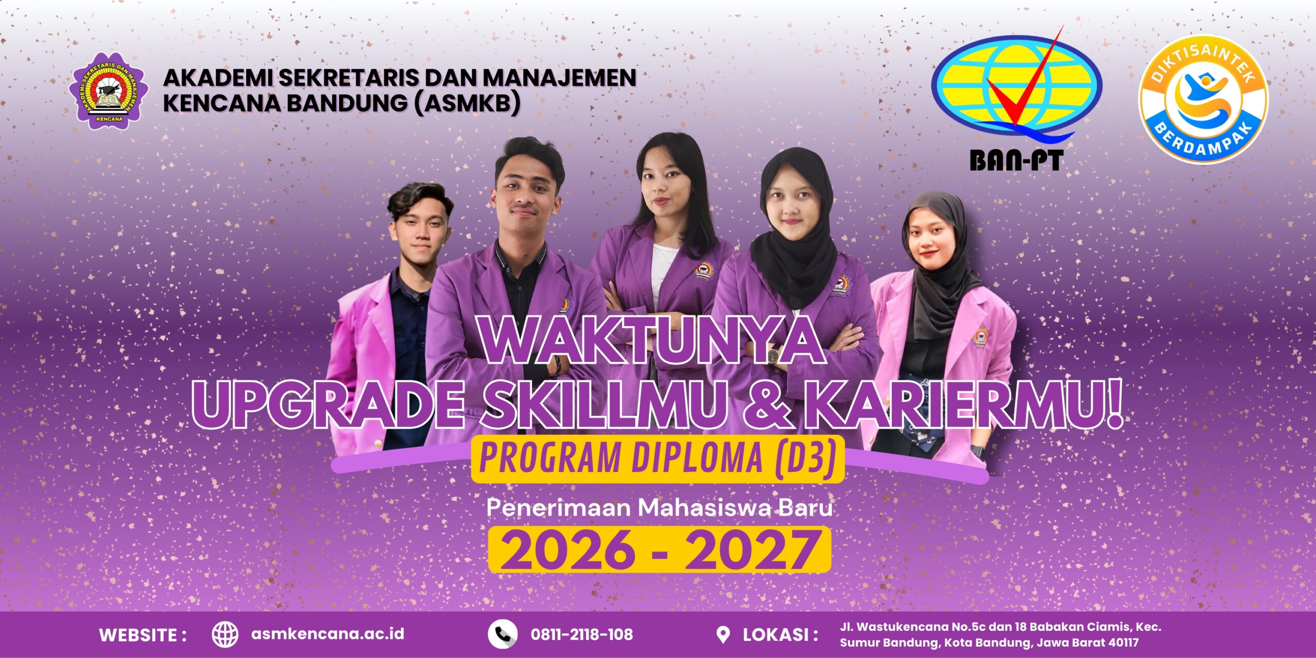 Akademi Sekretari dan Manajemen Kencana Bandung (ASMKB) telah resmi meraih Akreditasi dengan peringkat “Baik Sekali” dari BAN-PT, sebagai bentuk pengakuan atas mutu penyelenggaraan pendidikan, tata kelola institusi, serta komitmen berkelanjutan dalam menghasilkan lulusan yang kompeten dan siap bersaing di dunia kerja. Pencapaian ini mencerminkan kualitas kurikulum, profesionalisme dosen dan tenaga kependidikan, serta sistem pembelajaran yang efektif dan sesuai dengan standar nasional pendidikan tinggi.