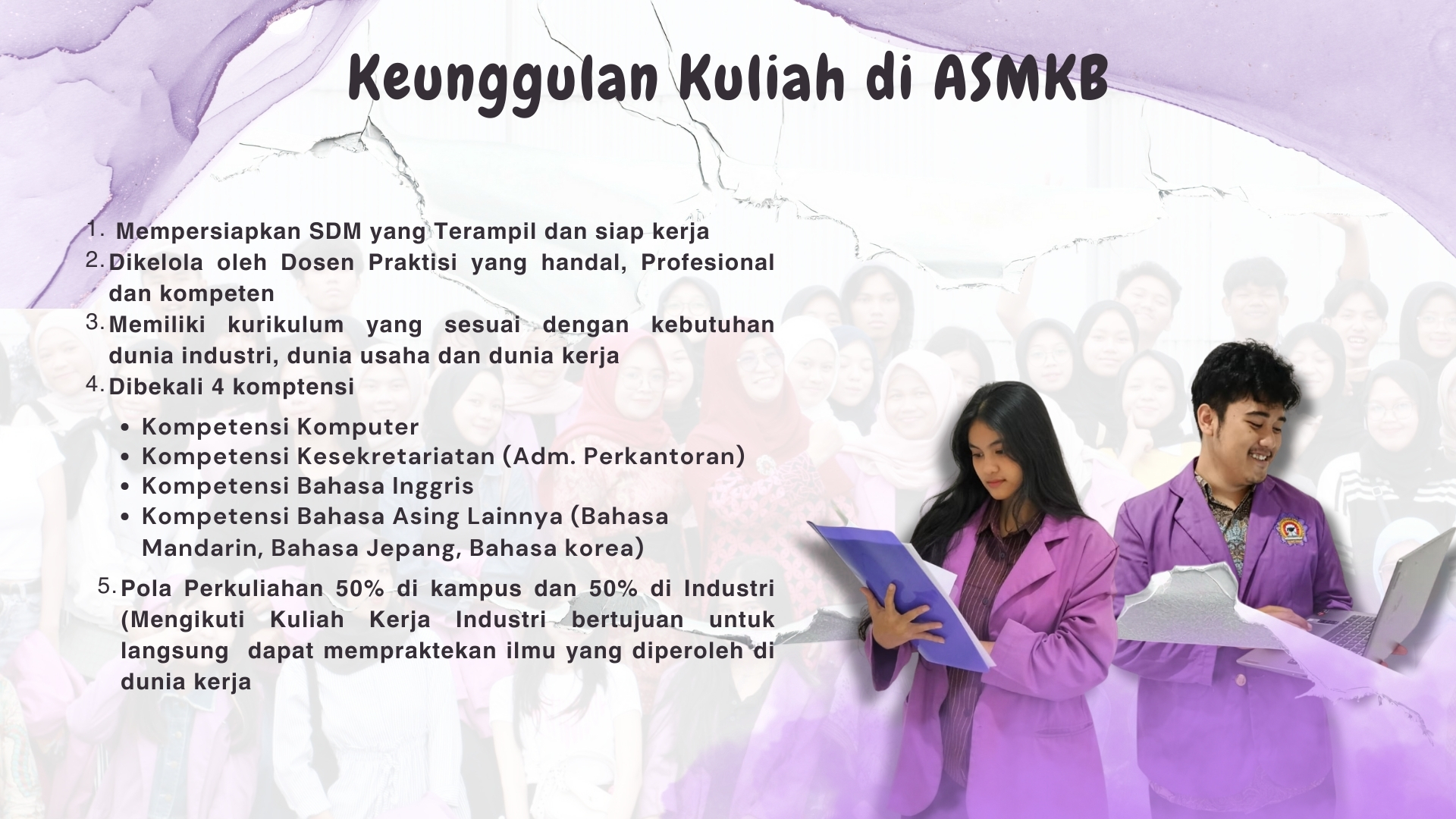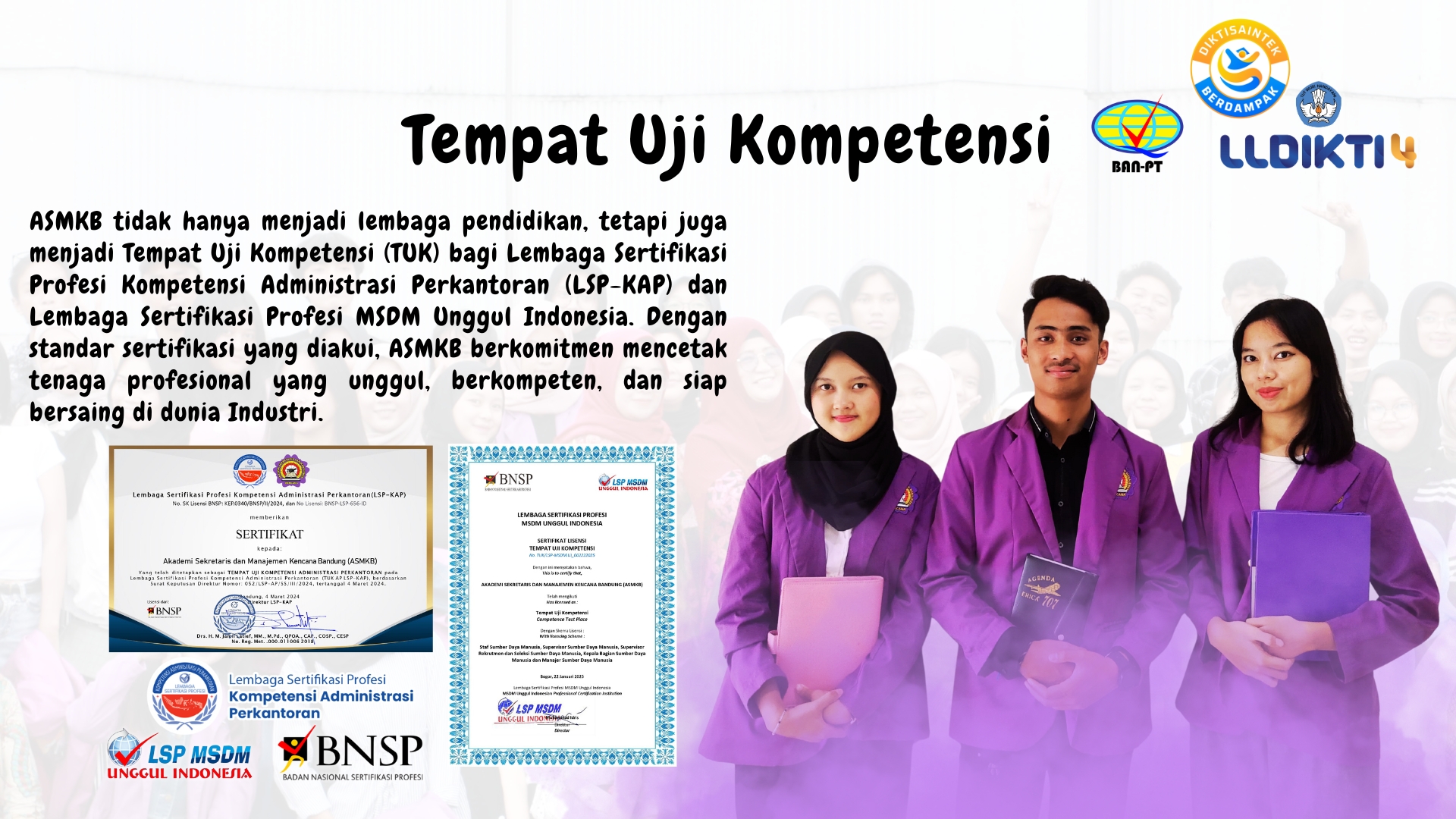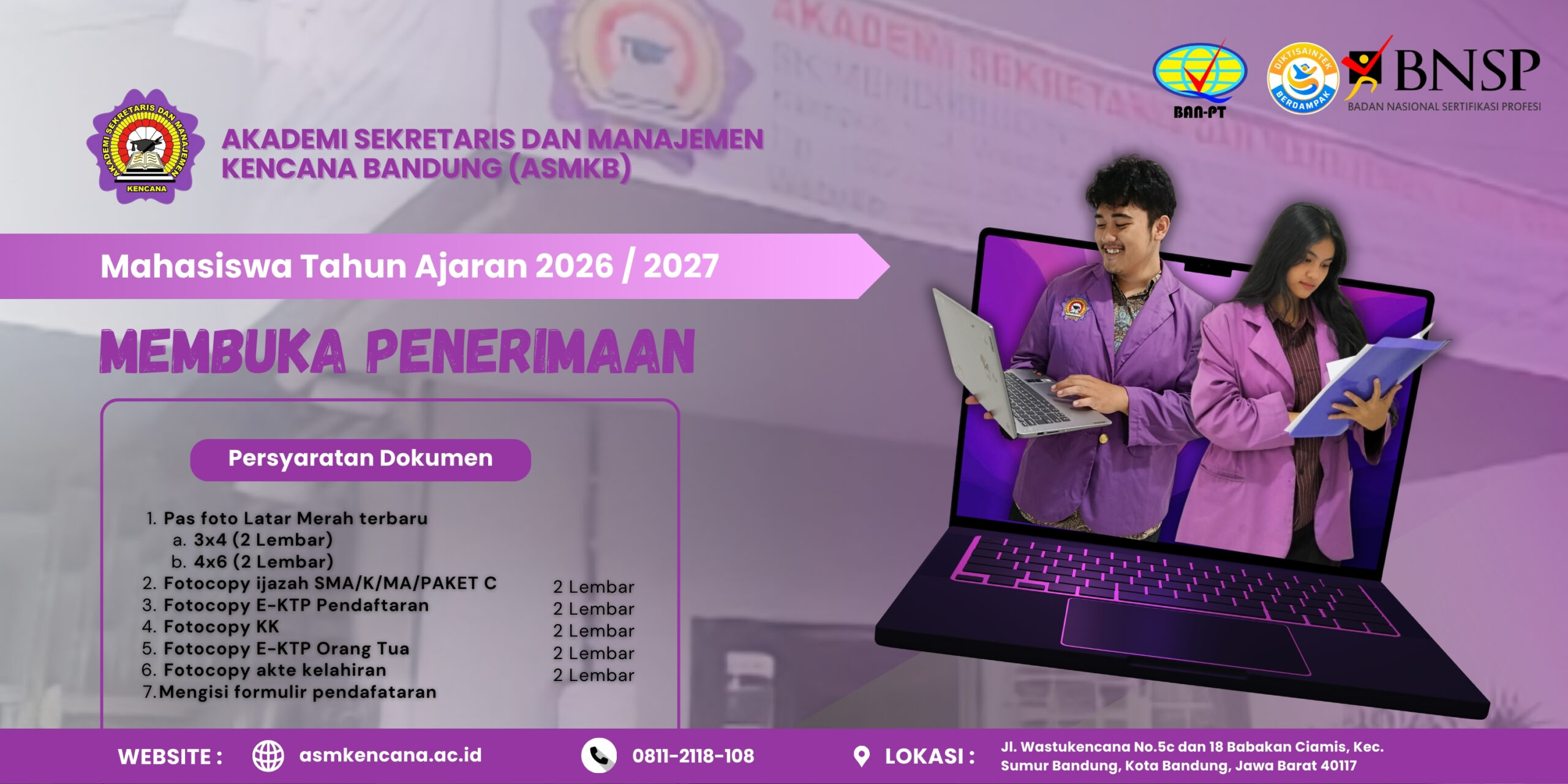Akademi Sekretari dan Manajemen Kencana Bandung (ASMKB) telah resmi meraih Akreditasi dengan peringkat “Baik Sekali” dari BAN-PT, sebagai bentuk pengakuan atas mutu penyelenggaraan pendidikan, tata kelola institusi, serta komitmen berkelanjutan dalam menghasilkan lulusan yang kompeten dan siap bersaing di dunia kerja. Pencapaian ini mencerminkan kualitas kurikulum, profesionalisme dosen dan tenaga kependidikan, serta sistem pembelajaran yang efektif dan sesuai dengan standar nasional pendidikan tinggi.
